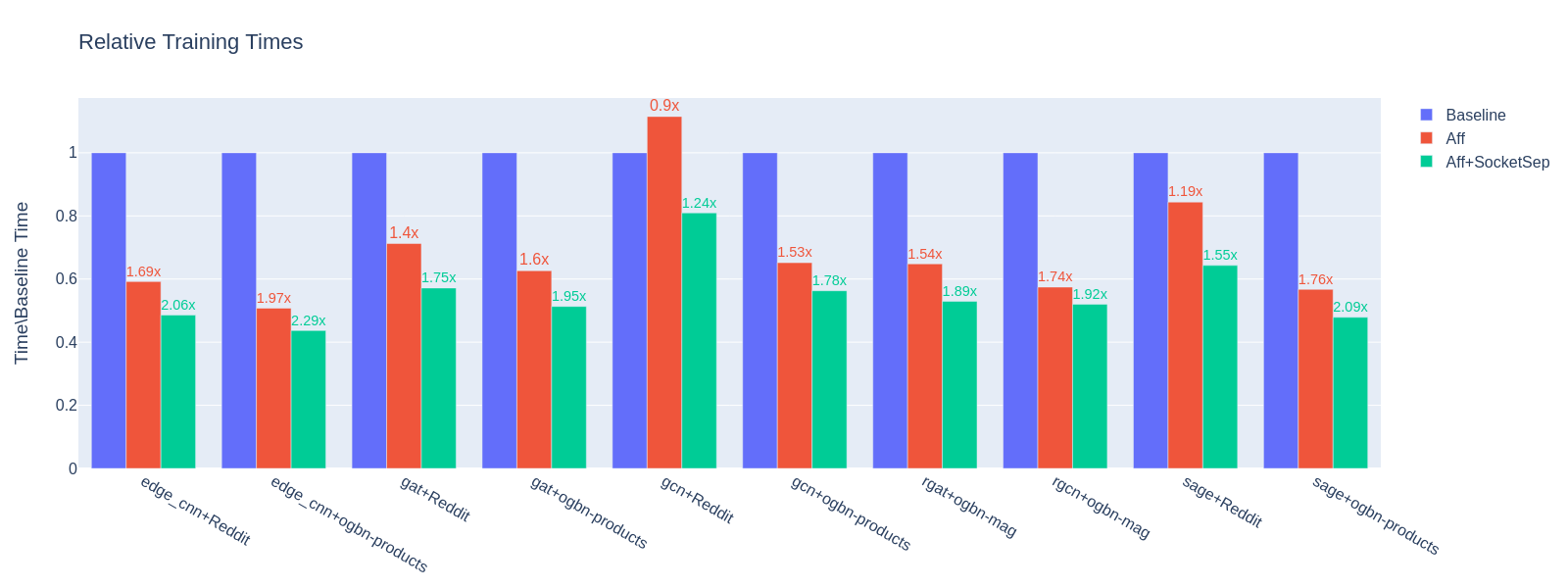 Over all model/dataset samples, the average training time is decreased by 1.53x for plain affinity and 1.85x for the affinity with socket separation.